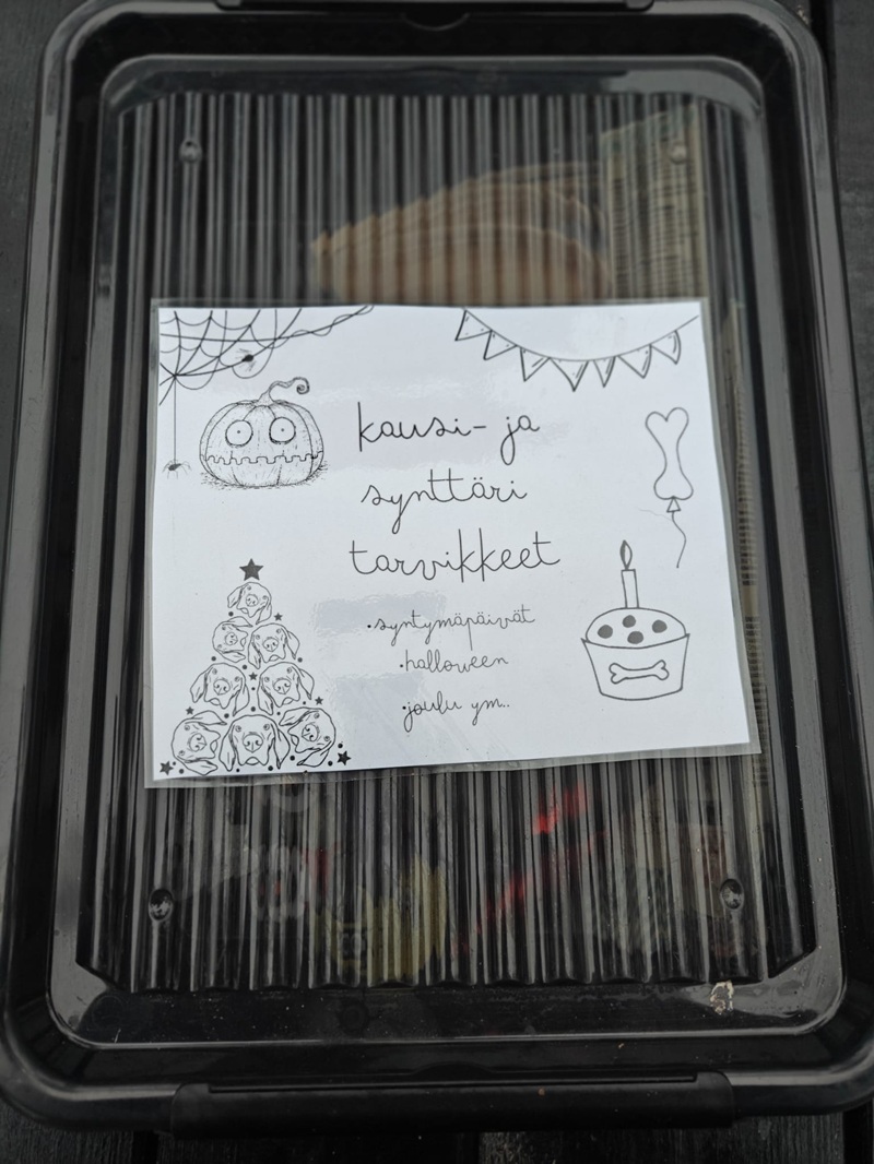Oletko aikeissa viettää koirasi syntymäpäivää koirametsässä? Meiltä löytyy teemalaatikko, jossa tarvikkeita juhliin ja rekvisiittaa valokuviin. Laatikon sisältö vaihtelee kausittain. Halloween väistyy ja joulu tulee pian tilalle, laatikko on koirametsällä koko joulukuun.
