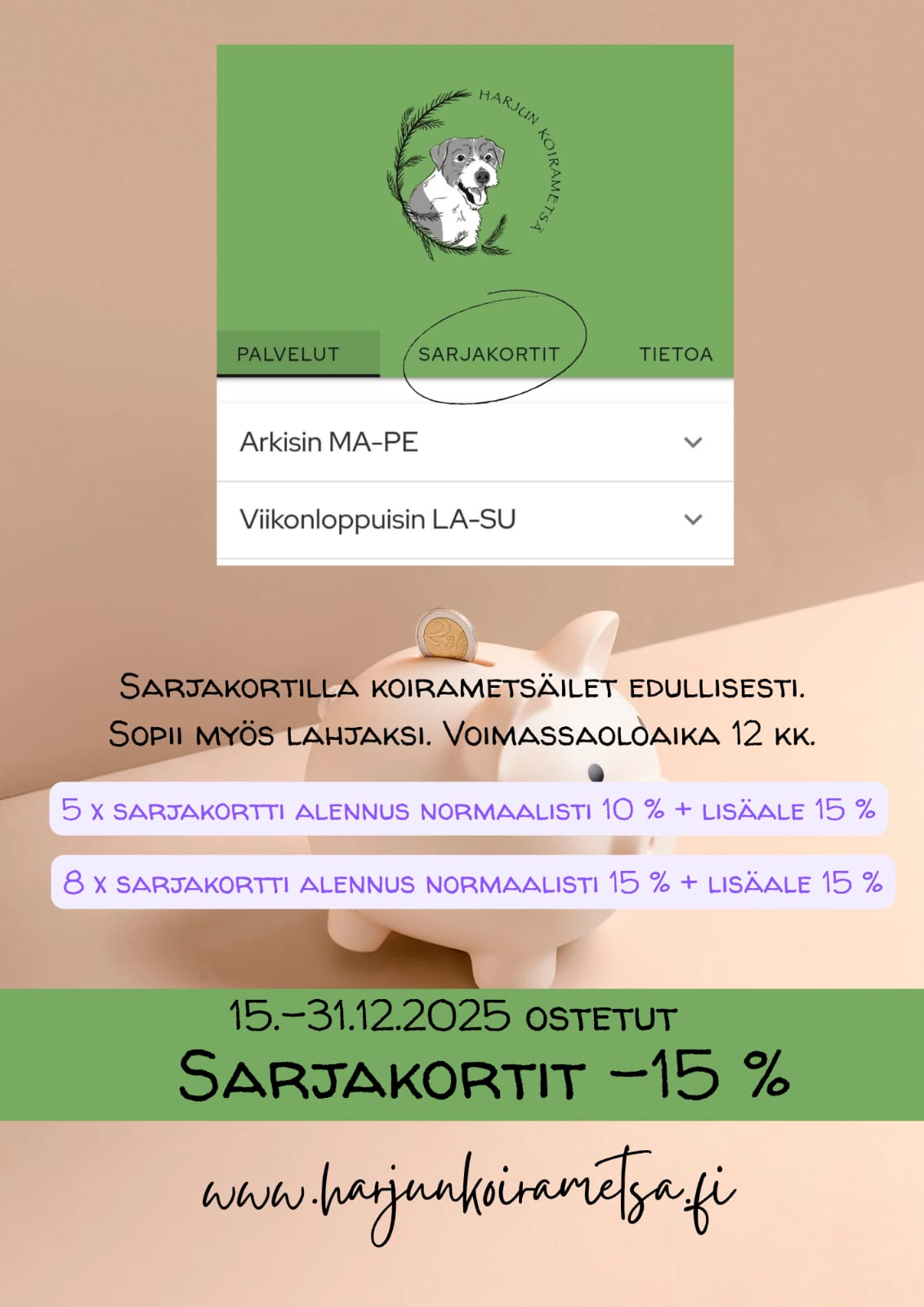 Kahdeksan kerran sarjakortilla koirametsäilet yhteensä 30 % normaalihintoja edullisemmin.