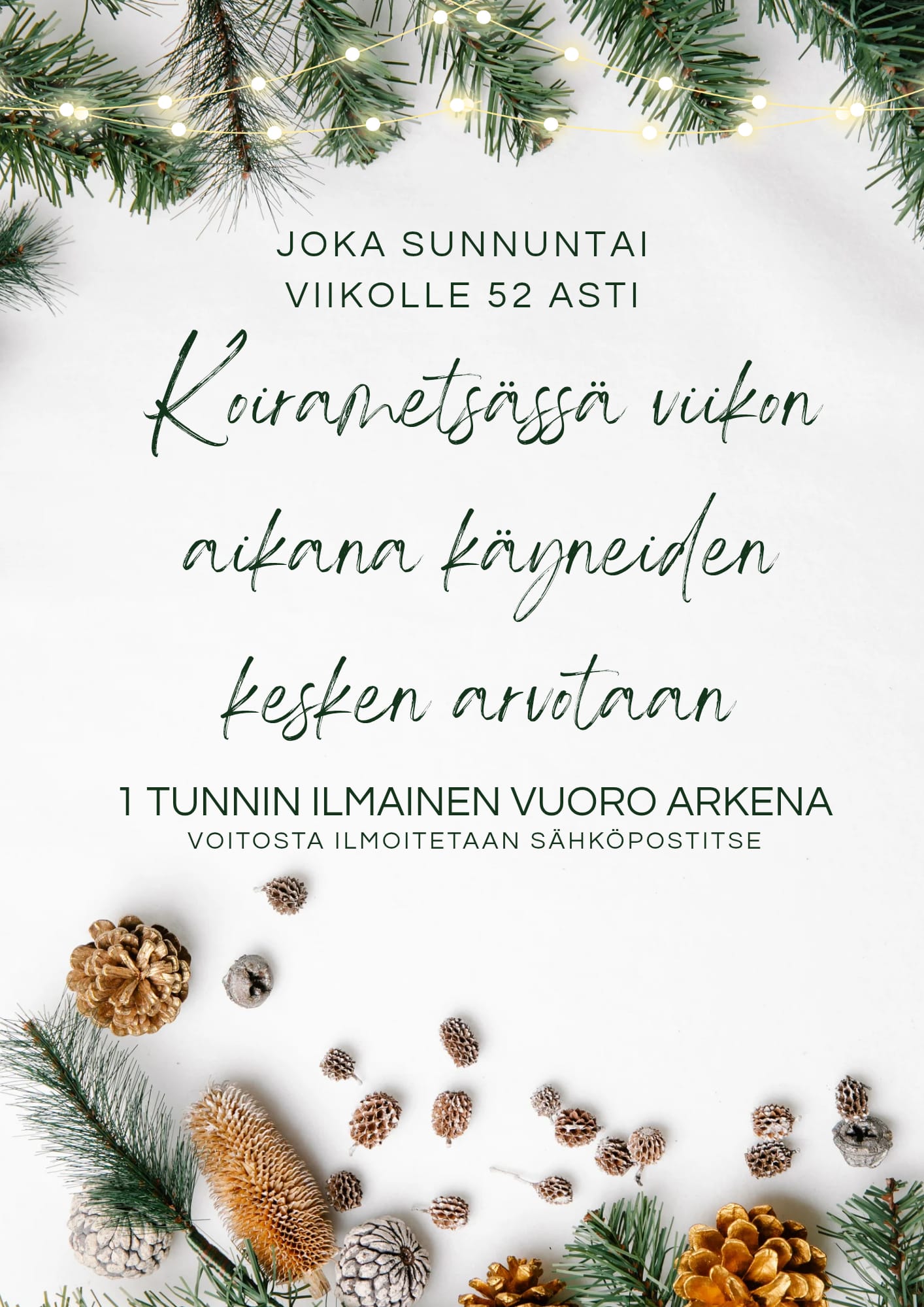 15% alennukseen oikeuttavan koodin voit käyttää kaikkiin koirametsävuoroihin (ei koske sarjakortteja tai lahjakortteja).