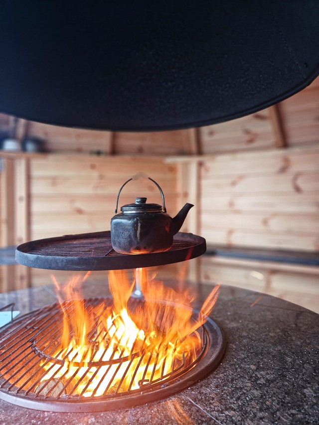 Tulta pidetään yllä yhteisvoimin. Kotalaavulla on kuivaa koivuklapia, istuinalusia, villaviltti ja varusteita evästelyyn. Muistathan, että meiltä voi myös tilata eväskorin portille.