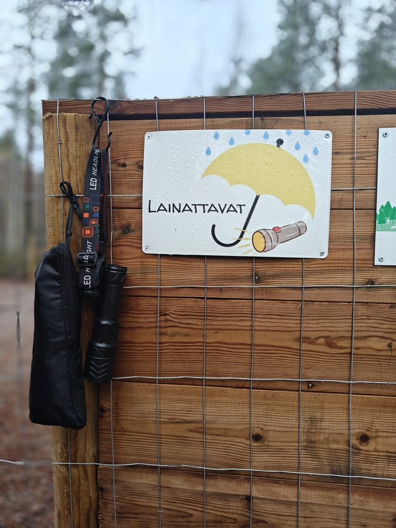 Koirametsän eteisessä on lainattavia lamppuja sekä sateenvarjo. Kotalaavulta löytyy lisäksi sadeviitta. Alueella on n. 20 patteritoimista kohdevalaisinta, mutta pimeällä metsäillessä suosittelemme otsalamppua tai käsivalaisinta ja koirille valopantaa tai heijastimia.