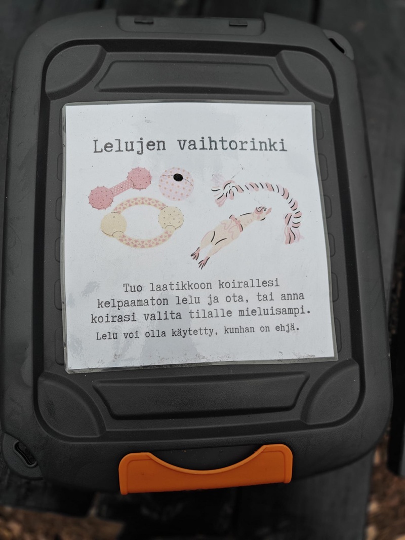 Kotalaavulla on laatikko, johon voit tuoda koirallesi ei niin mieluisat lelut, vaihdossa voitte valita kivan ja valmiiksi mielenkiintoisen tuoksuisen lelun.