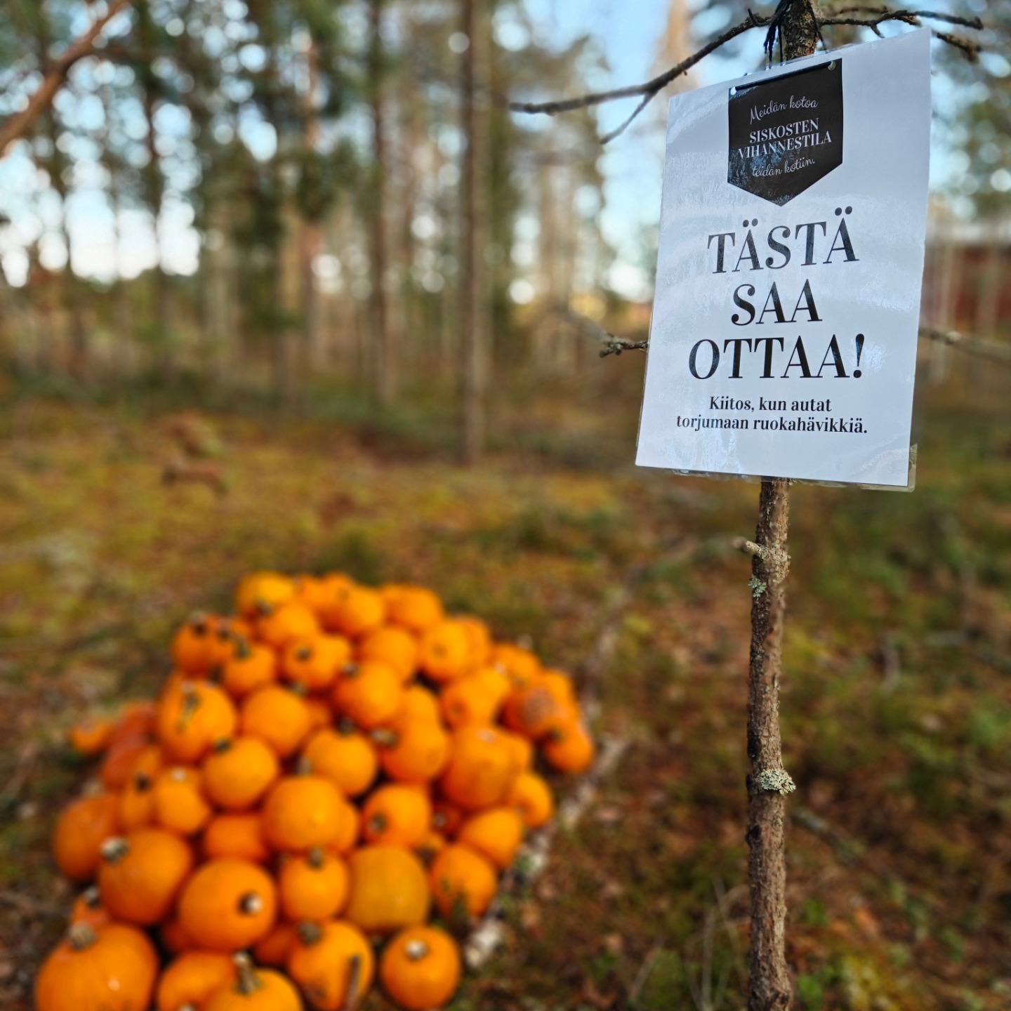 Ja hei, myös koirametsän ulkopuolella on iso kasa Siskosten lahjoittamia kurpitsoja, jotka sopivat hyvin kaiverrettavaksi lyhtykäyttöön. Metsässä vieraillessasi saat ottaa mukaasi kurpitsan – osallistut samalla turhan hävikin torjuntaan.